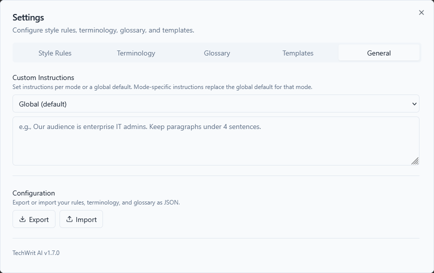 techwrit-config.jsonfile containing your rules, terminology, glossary, custom instructions (global and per-mode), and custom prompts. - Import — Loads a previously exported JSON file, replacing your current configuration.