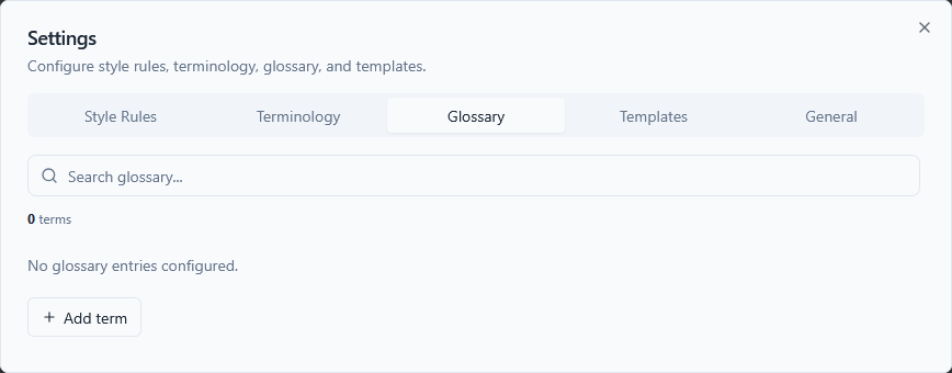 The AI uses glossary definitions when writing, flags synonym misuse in reviews, and generates glossary sections from your content.