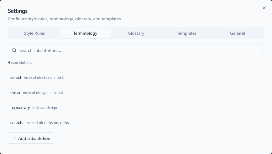 Terminology substitutions enforce word choice. Each entry has a preferred term and a list of terms to avoid.