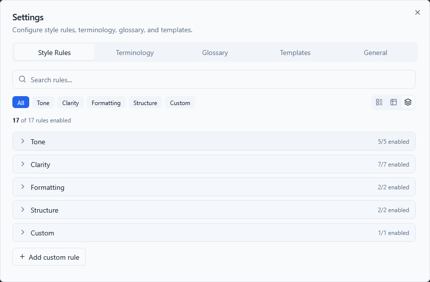 TechWrit AI ships with 25 default style rules covering common technical writing standards: